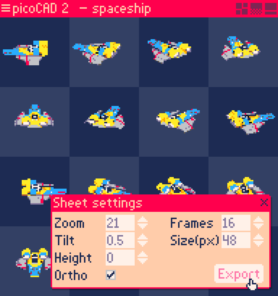 - Sprite sheet export: Easily create sprite sheets of any number of frames and size